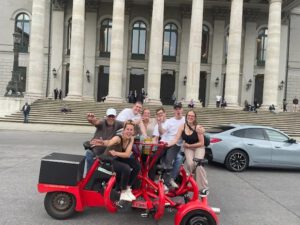 Mit meinem Kooperationspartner „Pedalhelden“ biete ich Conference Bike (CoBi) Touren an, die für bis zu 6 Gästen Platz bieten (Pedalhelden hat bis zu 8 CoBi’s). Erlebt München gemeinsam mit euren Freunden, Kollegen oder der Familie und genießt die lustige und interaktive Tour mit Bier, Prosecco oder sonstigen Getränken durch die Stadt. Auch perfekt geeignet als Junggesellenabschied. Bei Lust und Laune (und entsprechendem Wetter) springe ich mit euch gemeinsam in den Eisbach.